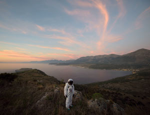 Gaia Squarci extends the role of text, with black-and-white images equal in size to the first-person accounts of their subjects. A man has seen a column of smoke above buildings that can no longer offer protection, and now so will you, while another has witnessed "a black hole where my corner deli used to be." A young woman with shuttered eyes appears through glass made more opaque by drops of water on "these nights." Still another is "watching my world shrink"—a reminder for her that "anything can be snatched away from anyone." One-way arrows offer direction, only those street signs have twisted and crossed.