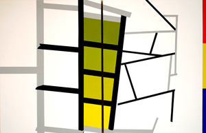 The elements could belong to architecture or, as Welish calls the show, "Painting as Diagram," but a diagram of what? The point is that the question matters. Painting here can serve as a diagram of imaginary structures, of their experience, of the gallery, or of painting itself, or it can mean painting as essentially schematic without referring to anything at all. All this sounds like a stern lecture in structural linguistics, but leaving the options open keeps the work at a remove from its own apparent formalism. Moreover, while individual works are rather discreet about their refusal to play ball, the salon hanging really lets loose. The scattered fragments, like randomly placed windows onto a larger space, make the gallery itself the diagram.